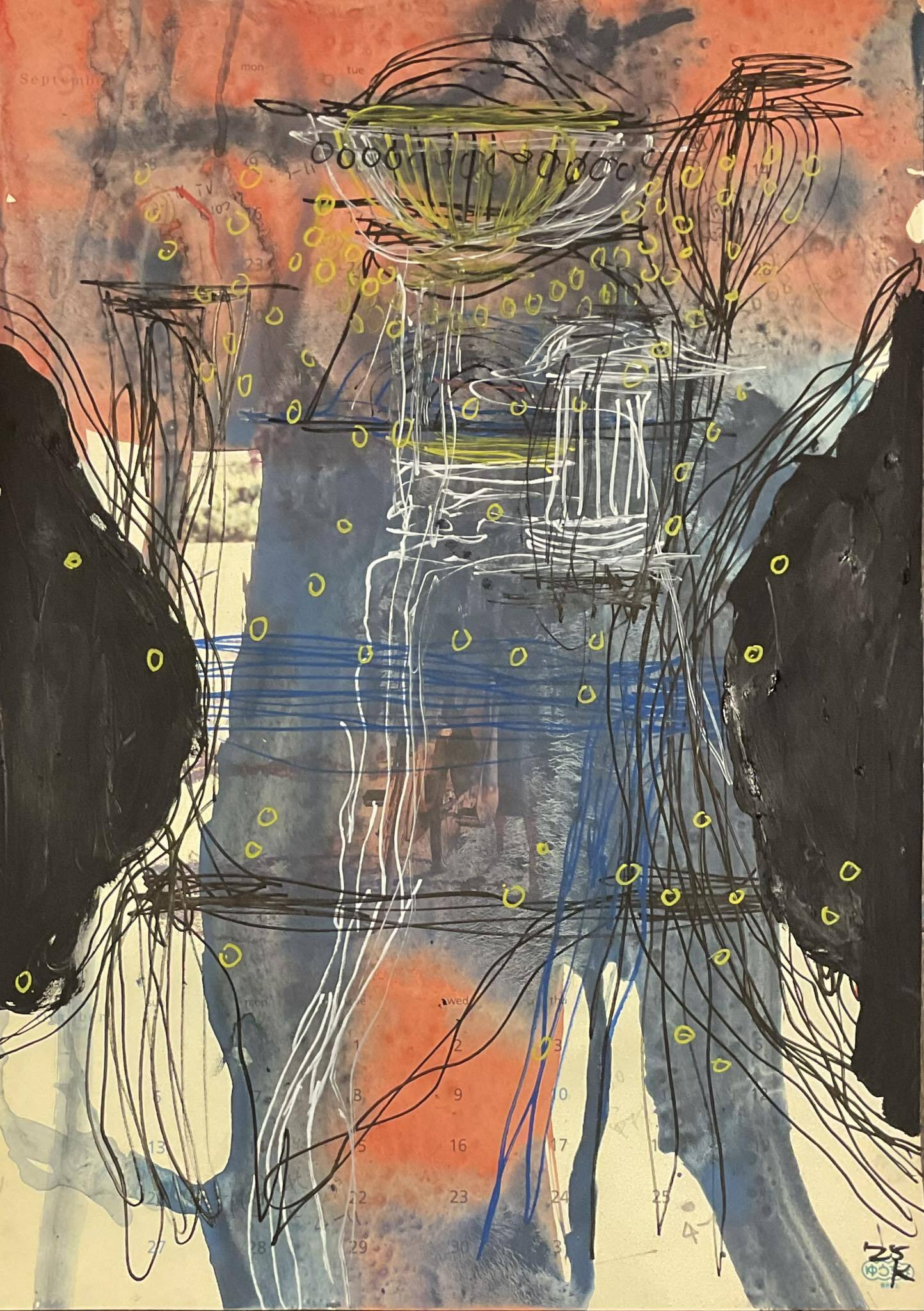 紙に丁寧に施されたジェッソと顔料マーカーによって、深みのある色彩と力強い表現が生まれています。この作品は、観る者に考察を促し、時には感情を揺さぶる力を持っています。アートを愛する方々にとって、心を打つ一枚となることでしょう!