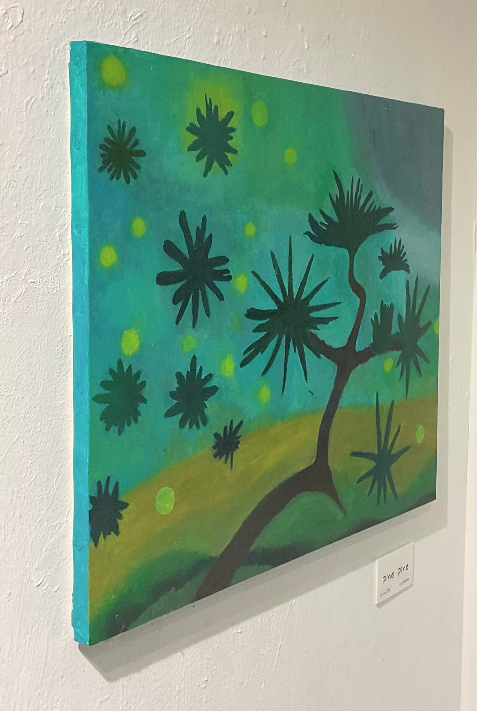 2025年、K.Art Studioにて開催された藤井秋人「青天のヘキレキ」展に出品された作品。52.8x45.3cm、キャンバスにアクリル絵具。作品は緑豊かな松の木が描かれており、自然の美しさを感じさせます。現代の自然と調和をテーマにした新作で、日常の中で忘れがちな静寂と豊かさを再発見するきっかけを提供します。この作品は、松の持つ力強い存在感が観る者の心に静かな感動を呼び覚まし、自然への愛を深める要素を持っています。