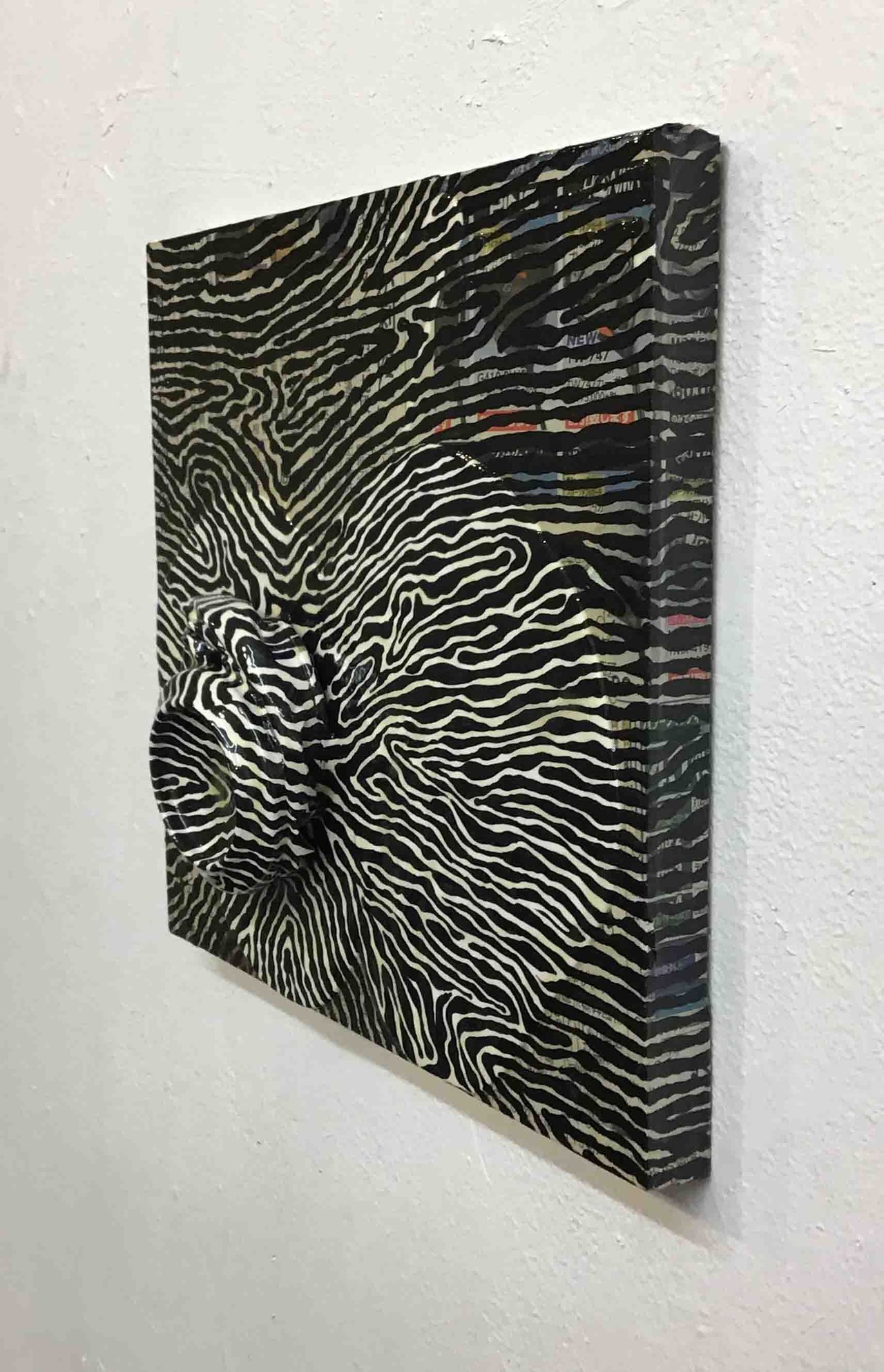 愛知を中心に活動する作家、タナカえんによる作品。緻密な描画が魅力。本作品は、2020年1月に、K.Art Studioで公開された作品。将来は、海外での展開も考えているとタナカ。23cmx23cm。タイトル「PARADIGM SHIFT白」パネルにミクストメディア。