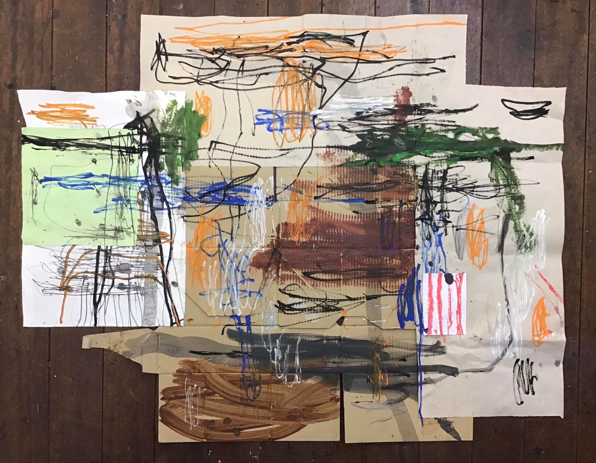 加藤K 2022年制作のコラージュ作品。タイトル「ジャズセッション」。加藤は、抽象画をジャズセッションのようなものだという。コラージュされた上に、油絵、顔料マジック等。110.5x66.5cm。額なし。専用シートとプラスチック段ボールに挟んでお送りします。
